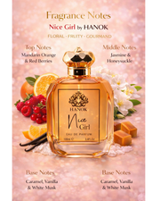 Nice Girl is a sweet, fruity, and floral fragrance with a warm, creamy finish. It opens with juicy red berries and mandarin orange, flows into a romantic floral heart of jasmine and honeysuckle, and dries down to a soft blend of caramel, vanilla, and white musk.